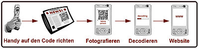 Kode QR dapat digunakan pada ponsel yang memiliki aplikasi pembaca kode QR dan memiliki akses internet GPRS atau WiFi atau 3G untuk menghubungkan ponsel dengan situs yang dituju via kode QR tersebut. Pelanggan, yang dalam hal ini adalah pengguna ponsel hanya harus mengaktifkan program pembaca kode QR, mengarahkan kamera ke kode QR, selanjutnya program pembaca kode QR akan secara otomatis memindai data yang telah tertanam pada kode QR. Jika kode QR berisikan alamat suatu situs, maka pelanggan dapat langsung mengakses situs tersebut tanpa harus lebih dulu mengetikkan alamat dari situs yang dituju. Jika ingin mengakses kode QR dengan ponsel tanpa kamera, maka hal pertama yang harus dilakukan oleh pengguna adalah dengan menjalankan terlebih dahulu aplikasi peramban yang ada pada ponsel, lalu masukkan URL halaman yang bersangkutan, selanjutnya masukkan “ID” atau 7 digit nomor yang tertera di bawah kode dan klik tombol Go, maka pengguna akan memperoleh konten digital yang diinginkan. Hal ini tentu mempermudah pelanggan dalam mendapatkan informasi yang ditawarkan oleh pemilik usaha. Jenis-Jenis aplikasi yang dapat membaca kode QR antara lain misalnya Kaywa Reader , yang dapat di instal pada ponselnokia,iMatrix, aplikasi untuk iPhone dan ZXing Decoder Online yang dapat digunakan untuk mendekode kode QR berupa imaji dengan memasukkan URL image maupun dengan menguploadnya